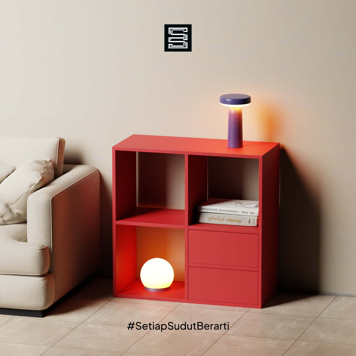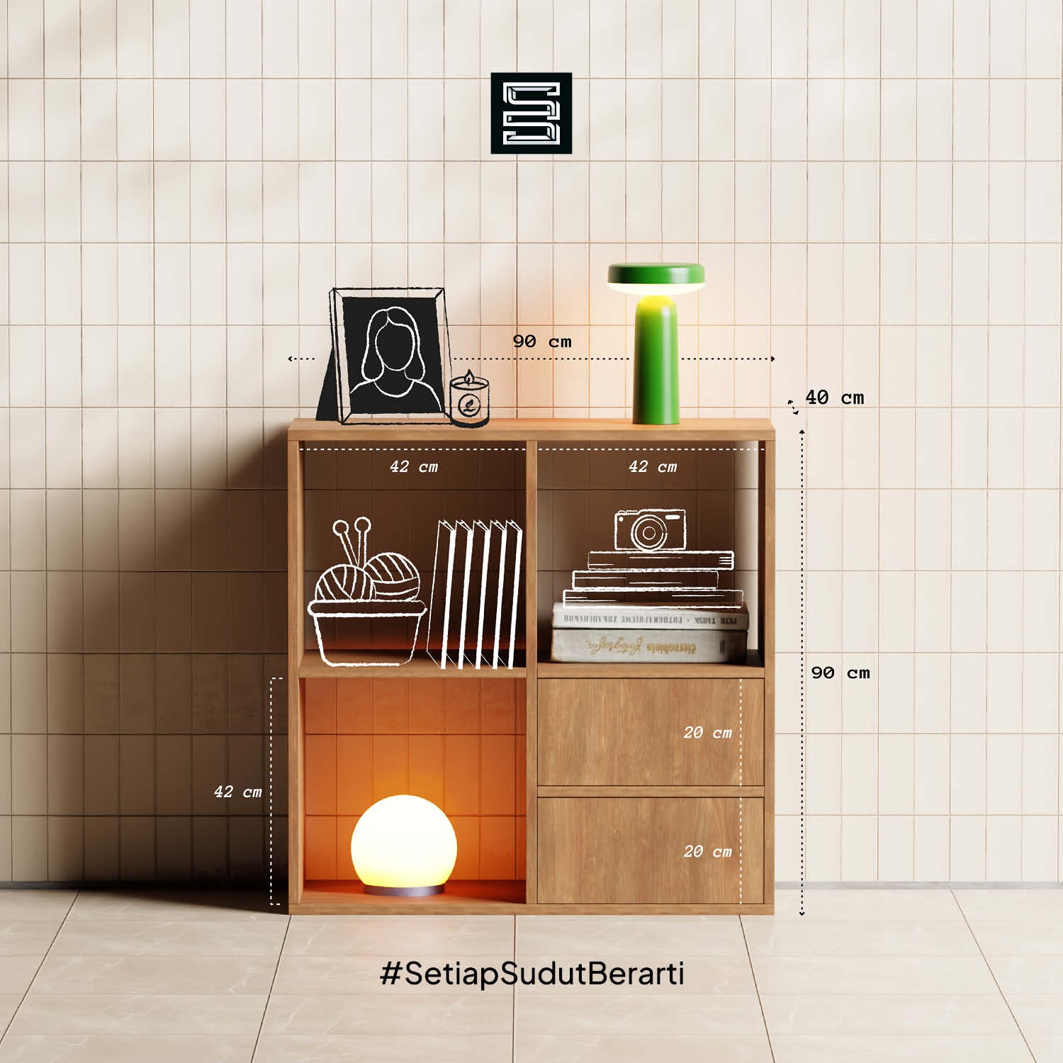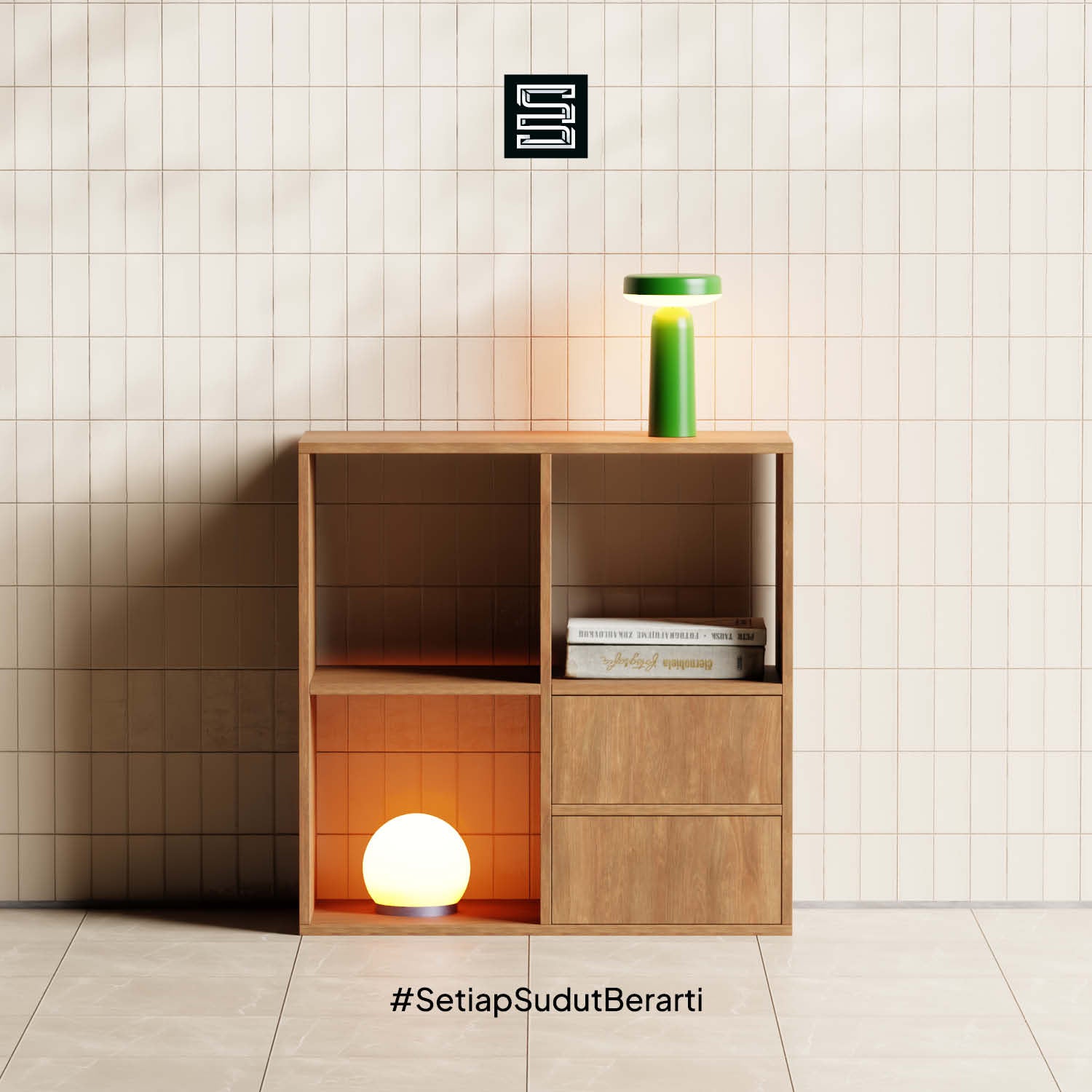 Rak buku serbaguna dengan kombinasi rak terbuka dan pintu tertutup. Proporsinya ideal untuk ruang kerja atau ruang tamu, menghadirkan tampilan rapi tanpa kehilangan karakter modernnya.