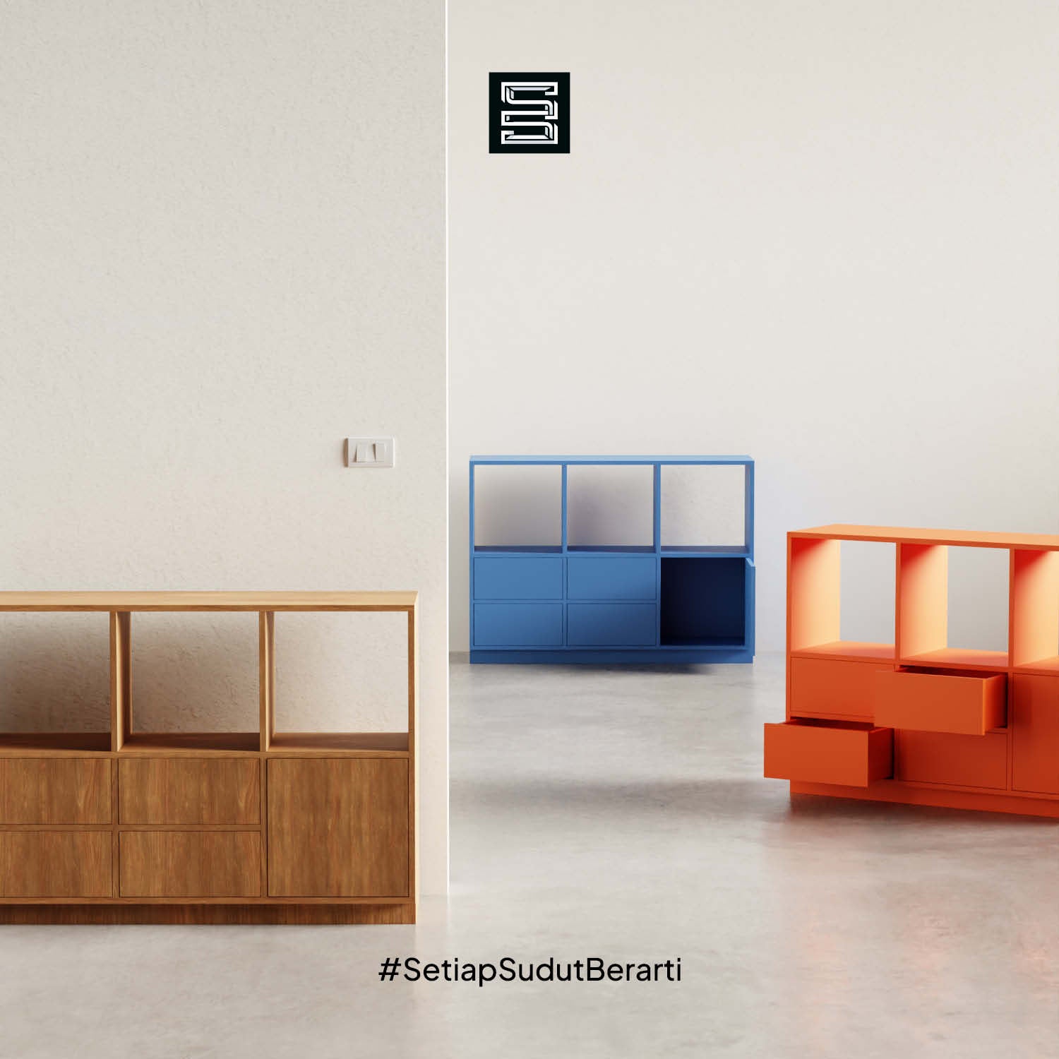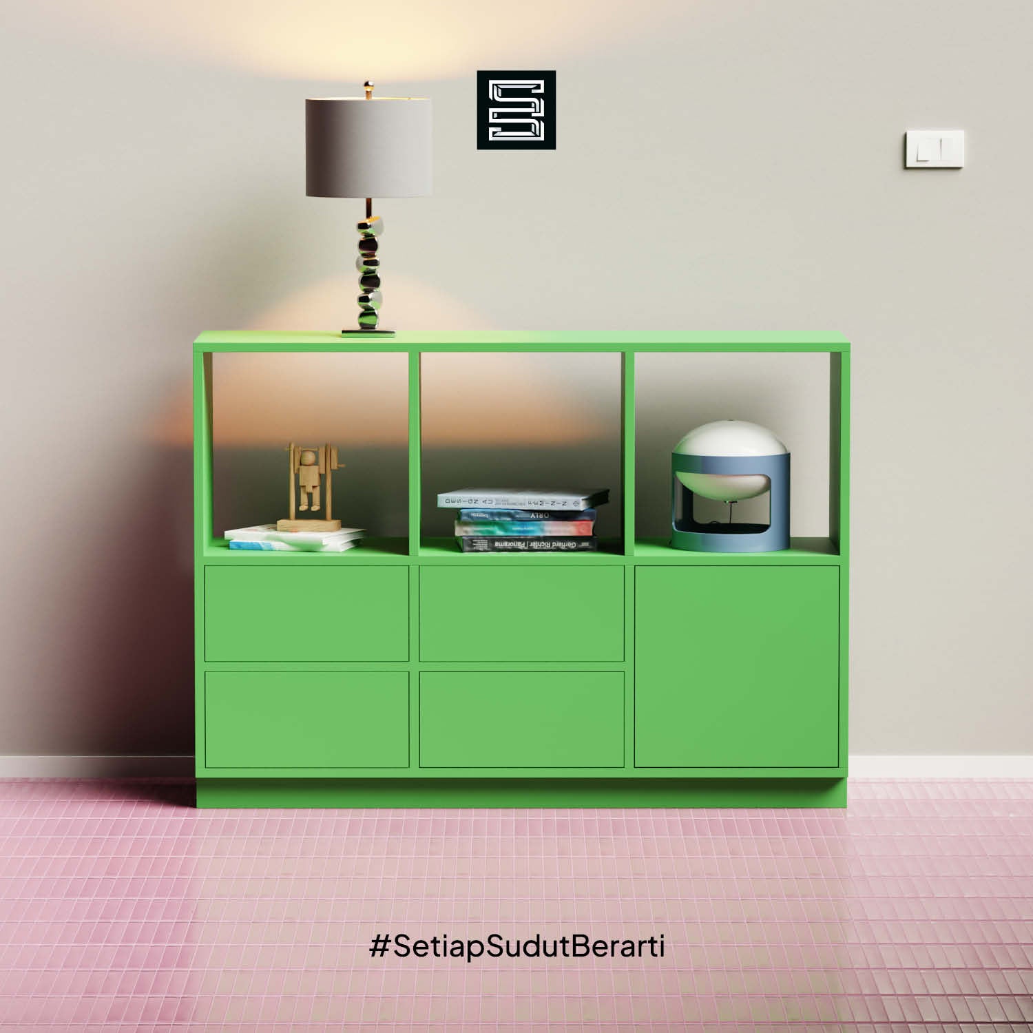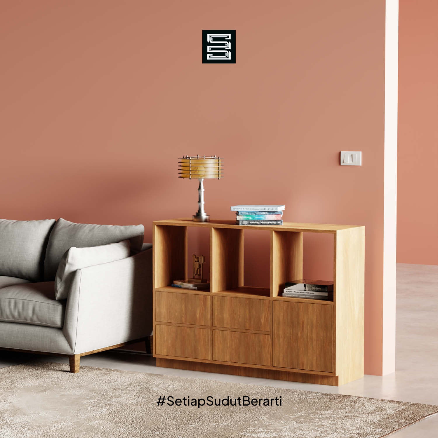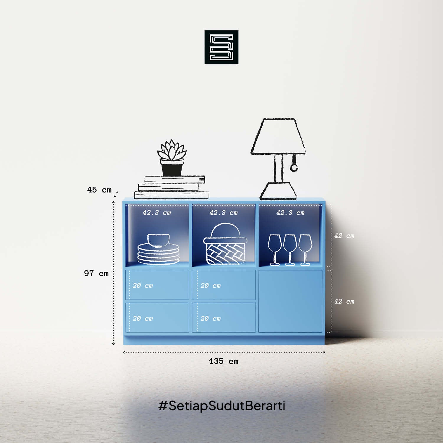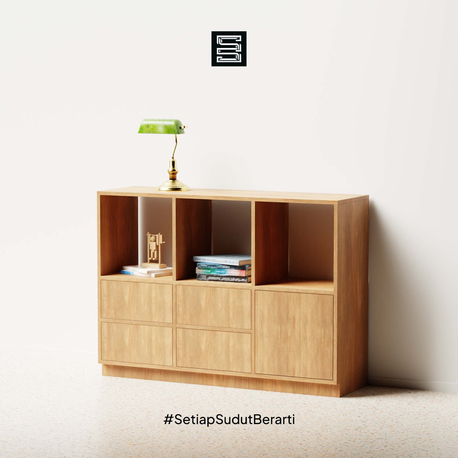 Buffet dengan desain minimalis modern yang memadukan fungsi dan estetika. Dilengkapi ruang terbuka dan laci tertutup untuk menyimpan perlengkapan makan, koleksi dekorasi, atau dokumen rumah tangga agar ruangan tetap bersih dan rapi.