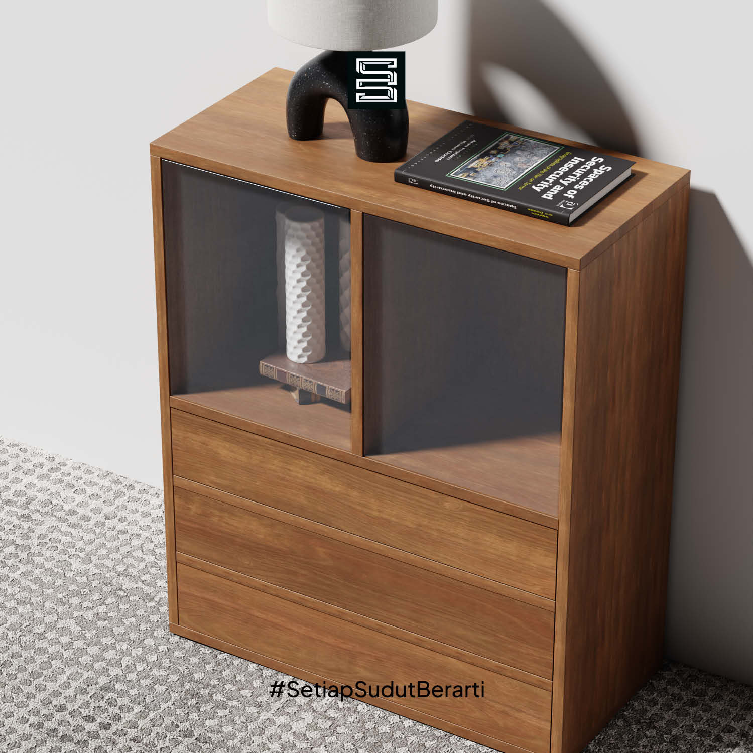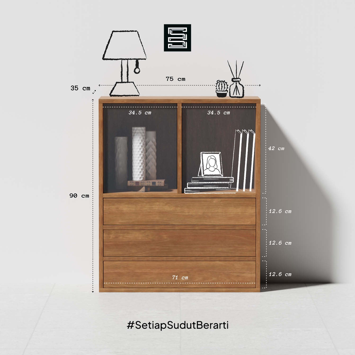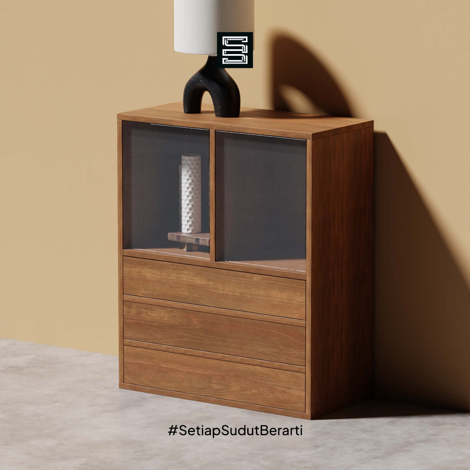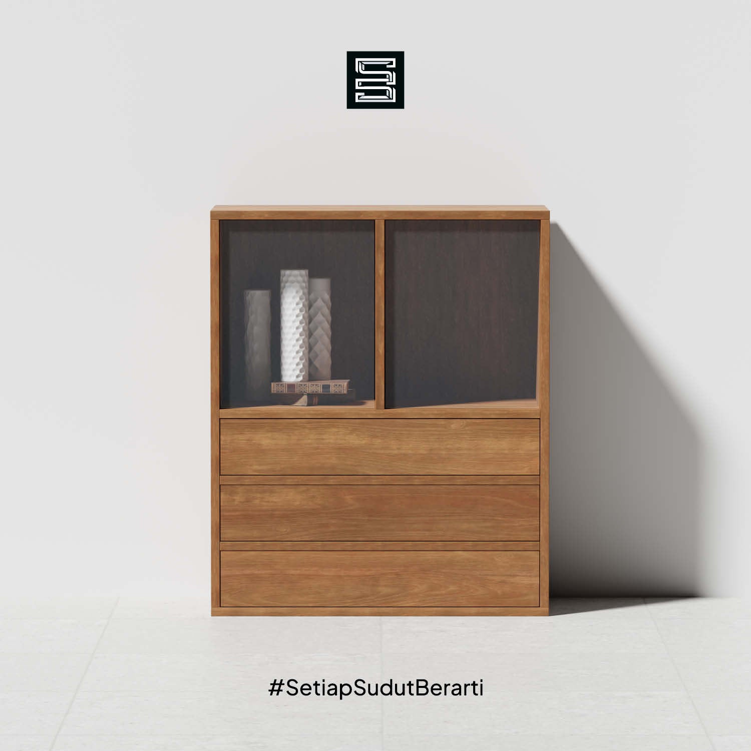 Buffet minimalis dengan kombinasi rak tertutup dan terbuka yang memudahkan penyimpanan perlengkapan makan atau dekorasi rumah. Proporsi lebarnya pas untuk ruang kecil.