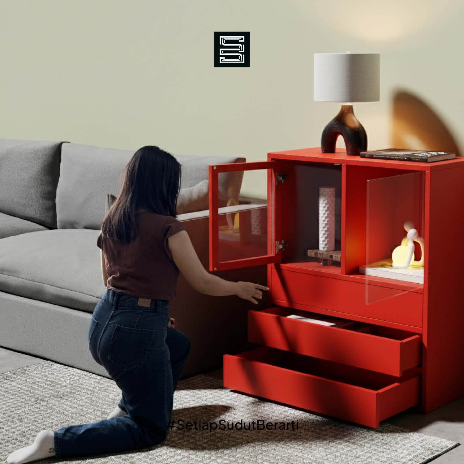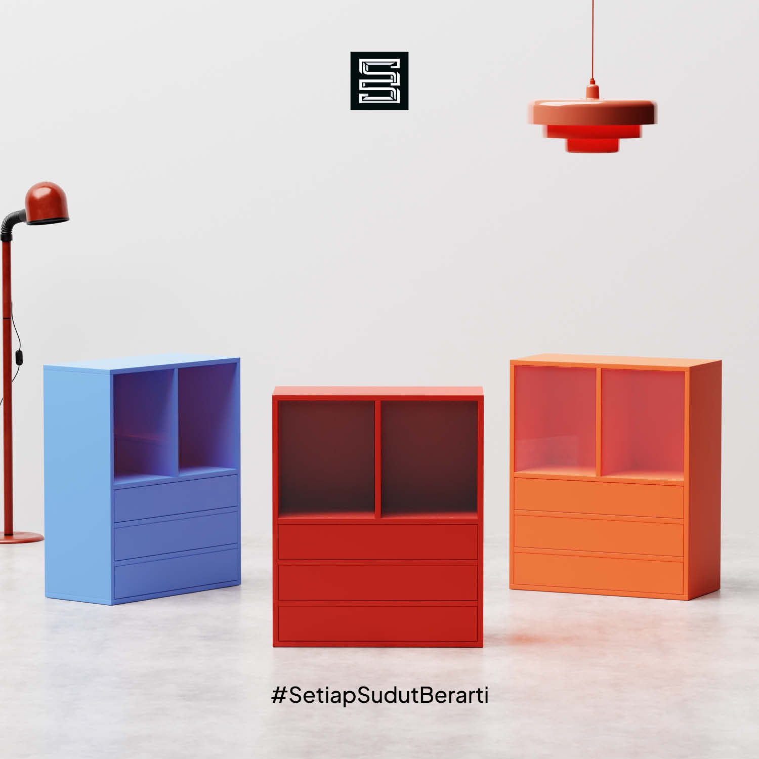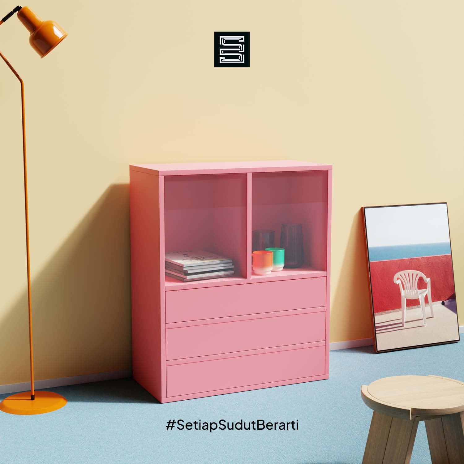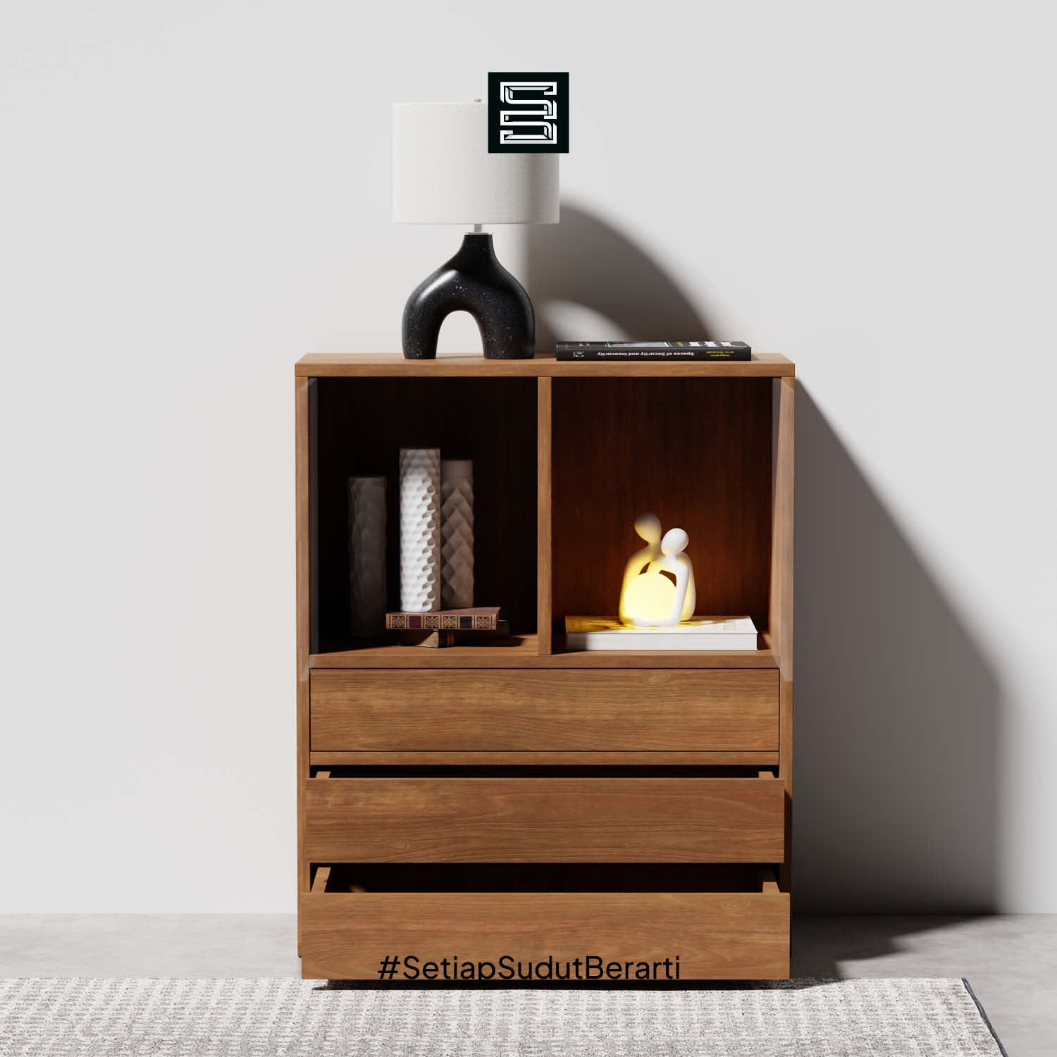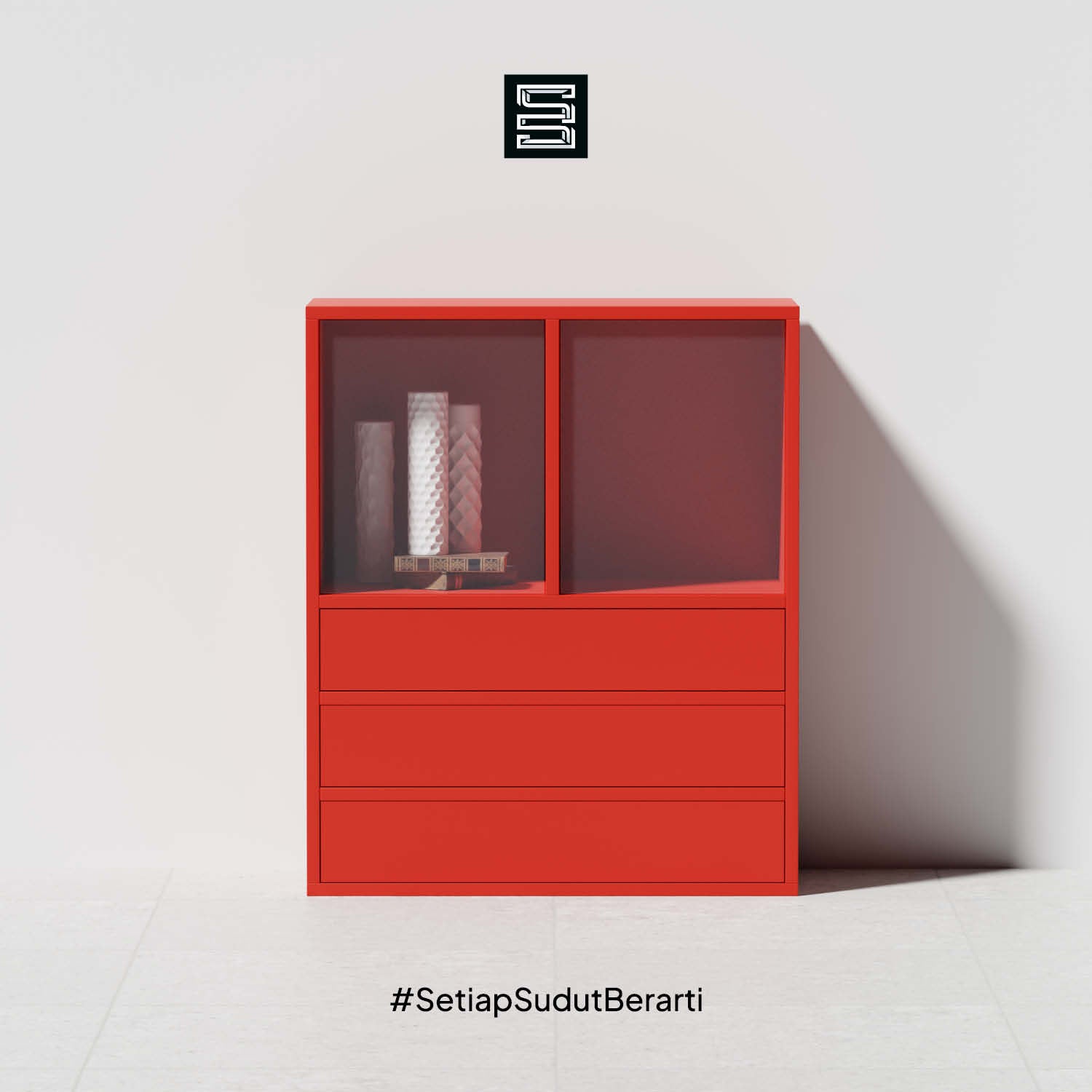 Buffet minimalis dengan kombinasi rak tertutup dan terbuka yang memudahkan penyimpanan perlengkapan makan atau dekorasi rumah. Proporsi lebarnya pas untuk ruang kecil.