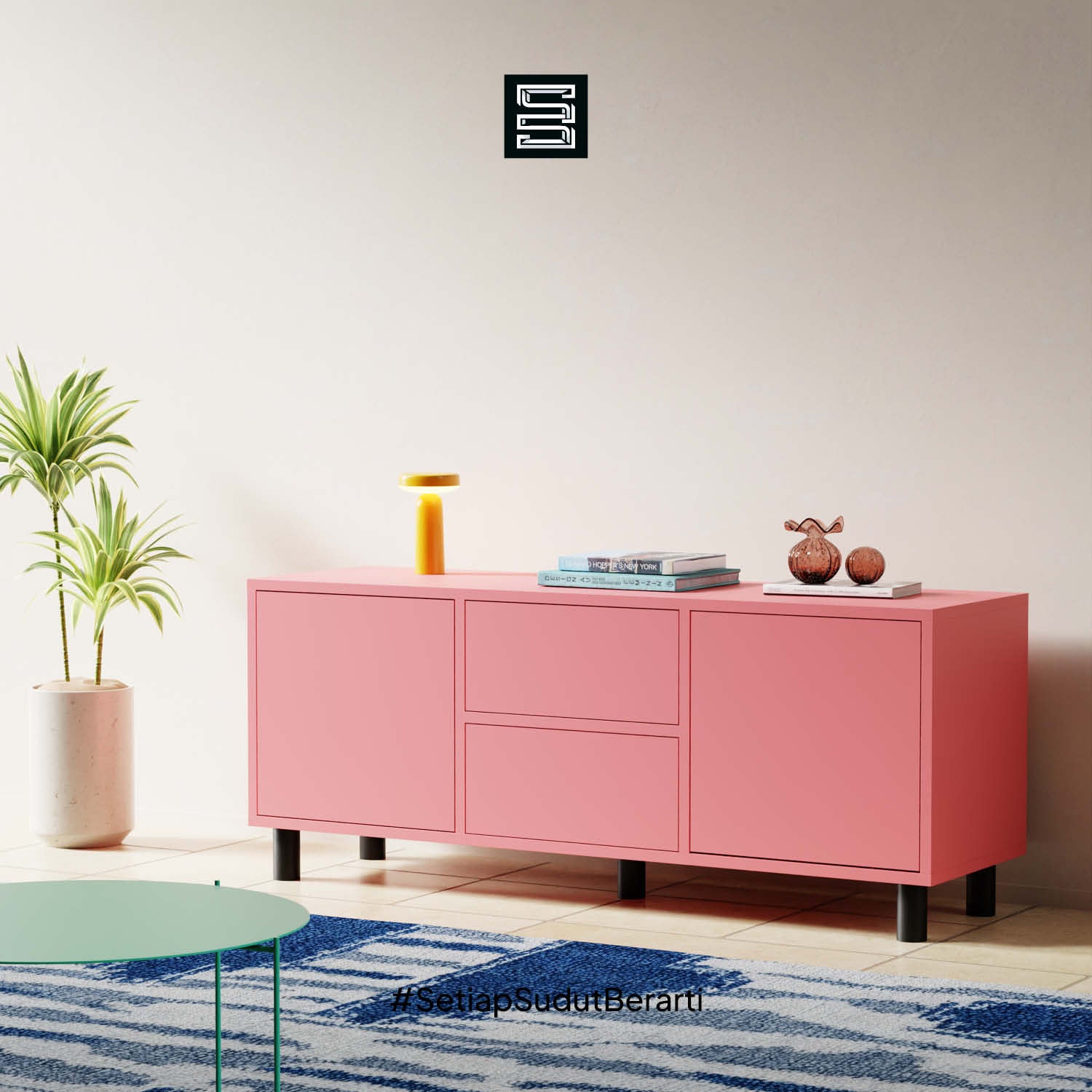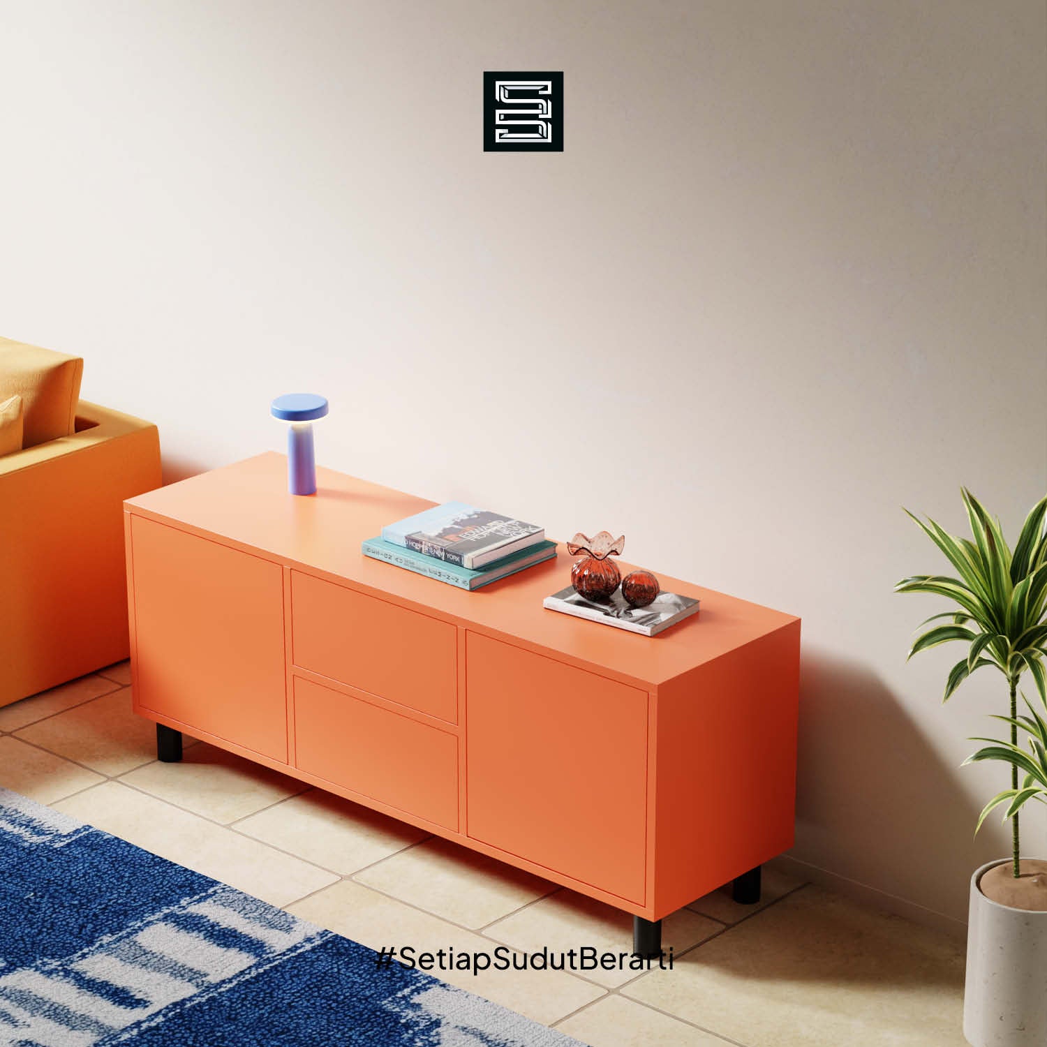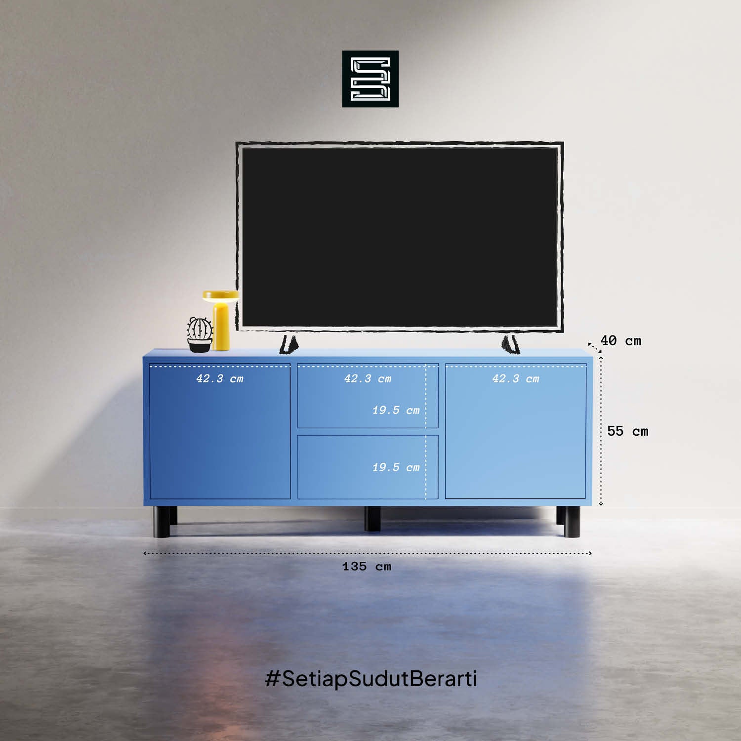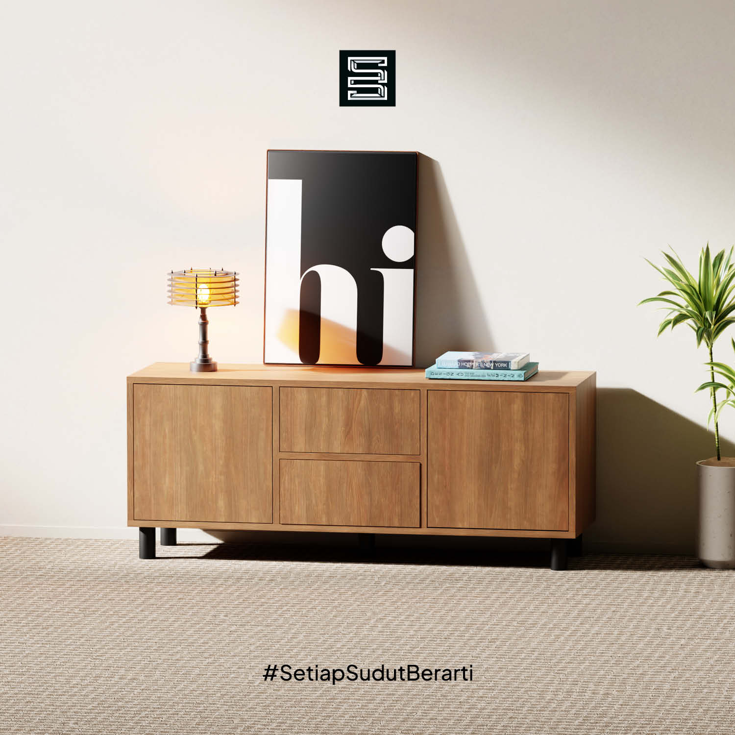 Meja TV modern dengan kombinasi ruang terbuka dan pintu tertutup untuk tampilan bersih. Proporsi panjangnya pas untuk TV besar sekaligus menyimpan alat elektronik dan dekorasi.