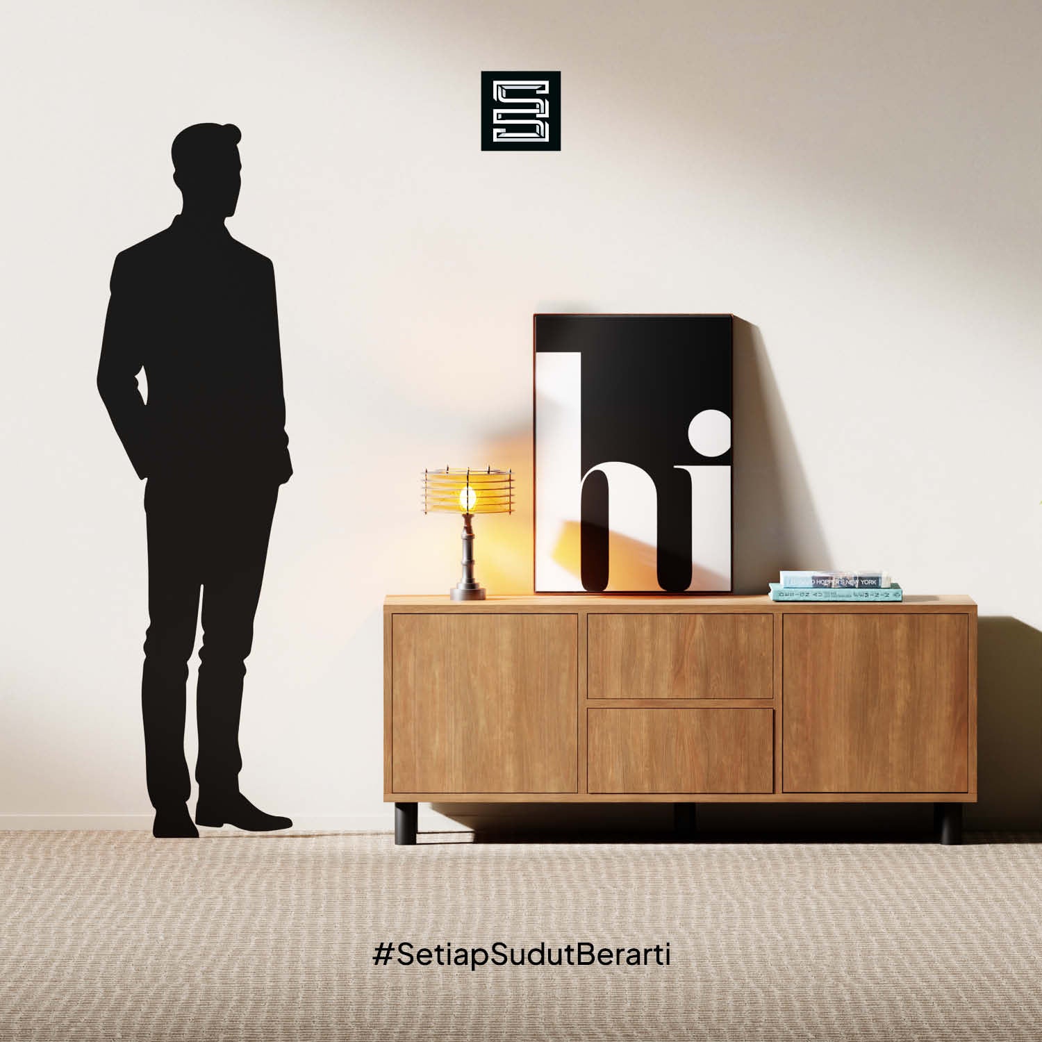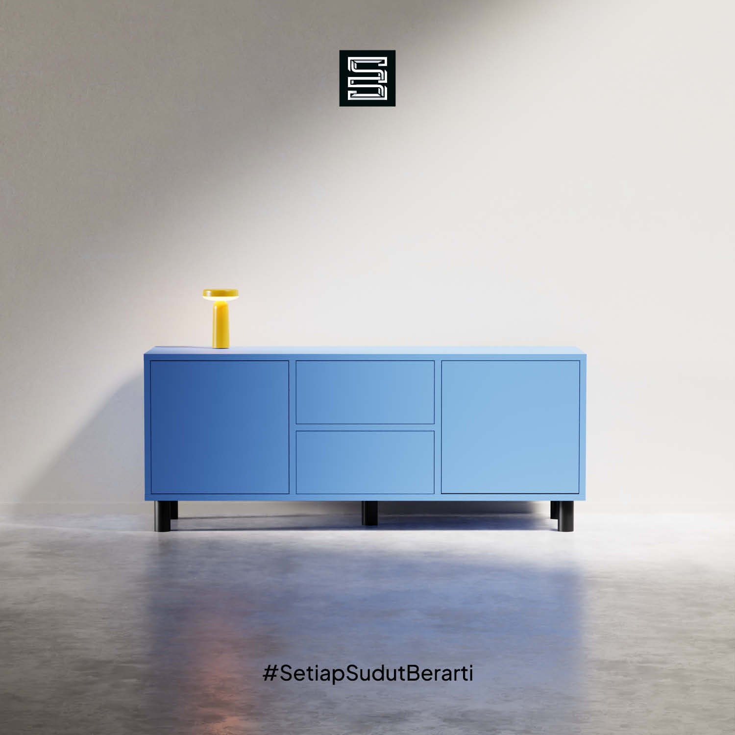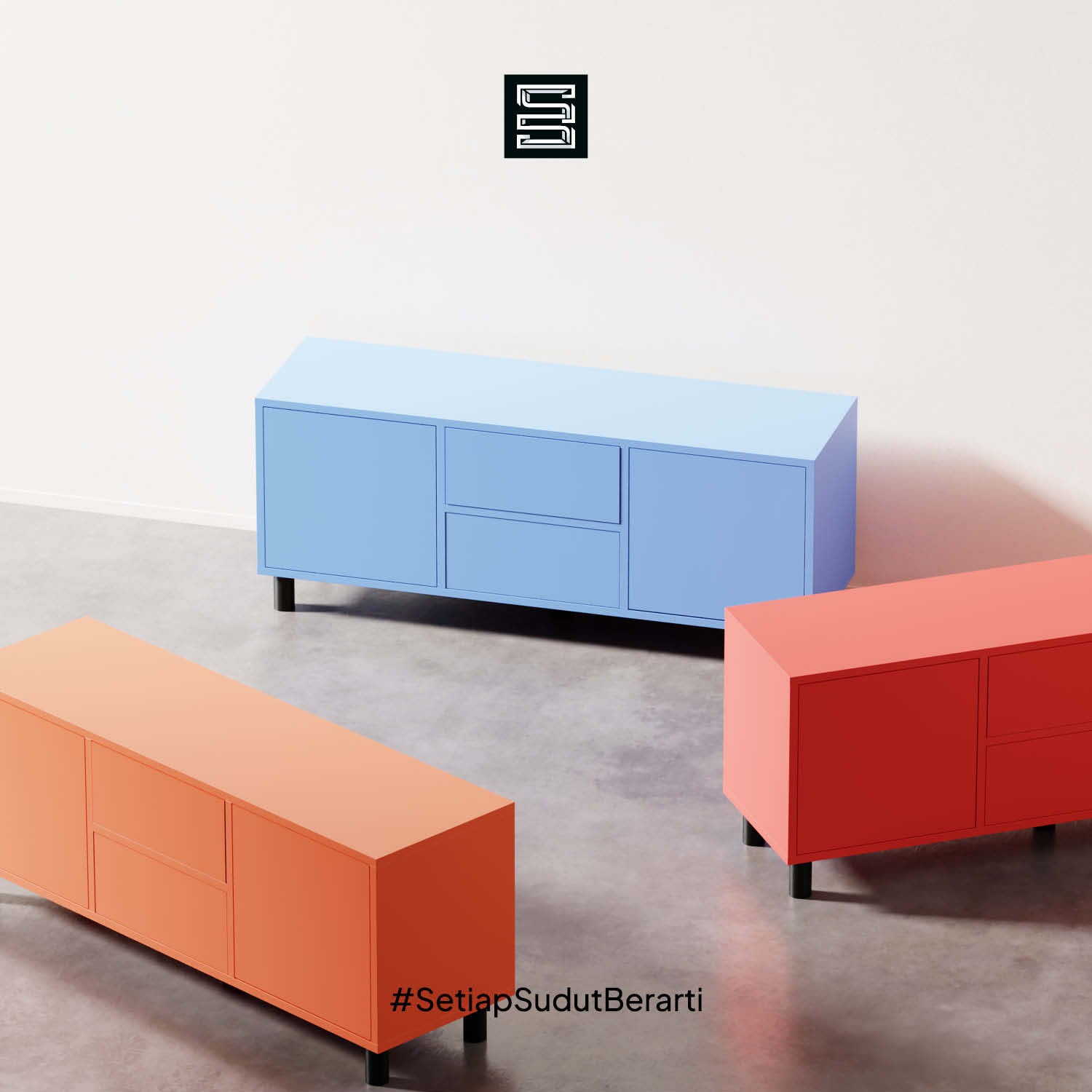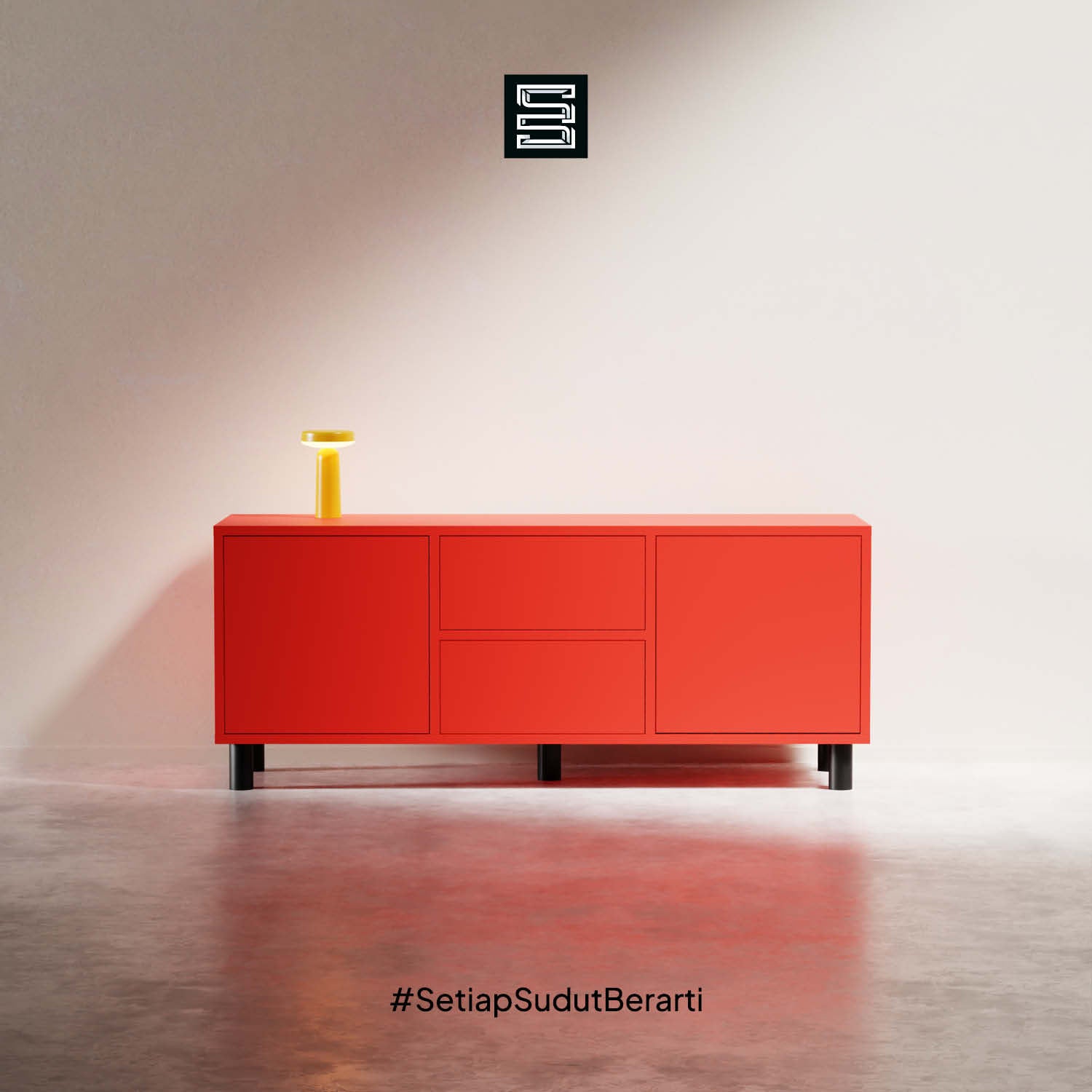 Meja TV modern dengan kombinasi ruang terbuka dan pintu tertutup untuk tampilan bersih. Proporsi panjangnya pas untuk TV besar sekaligus menyimpan alat elektronik dan dekorasi.