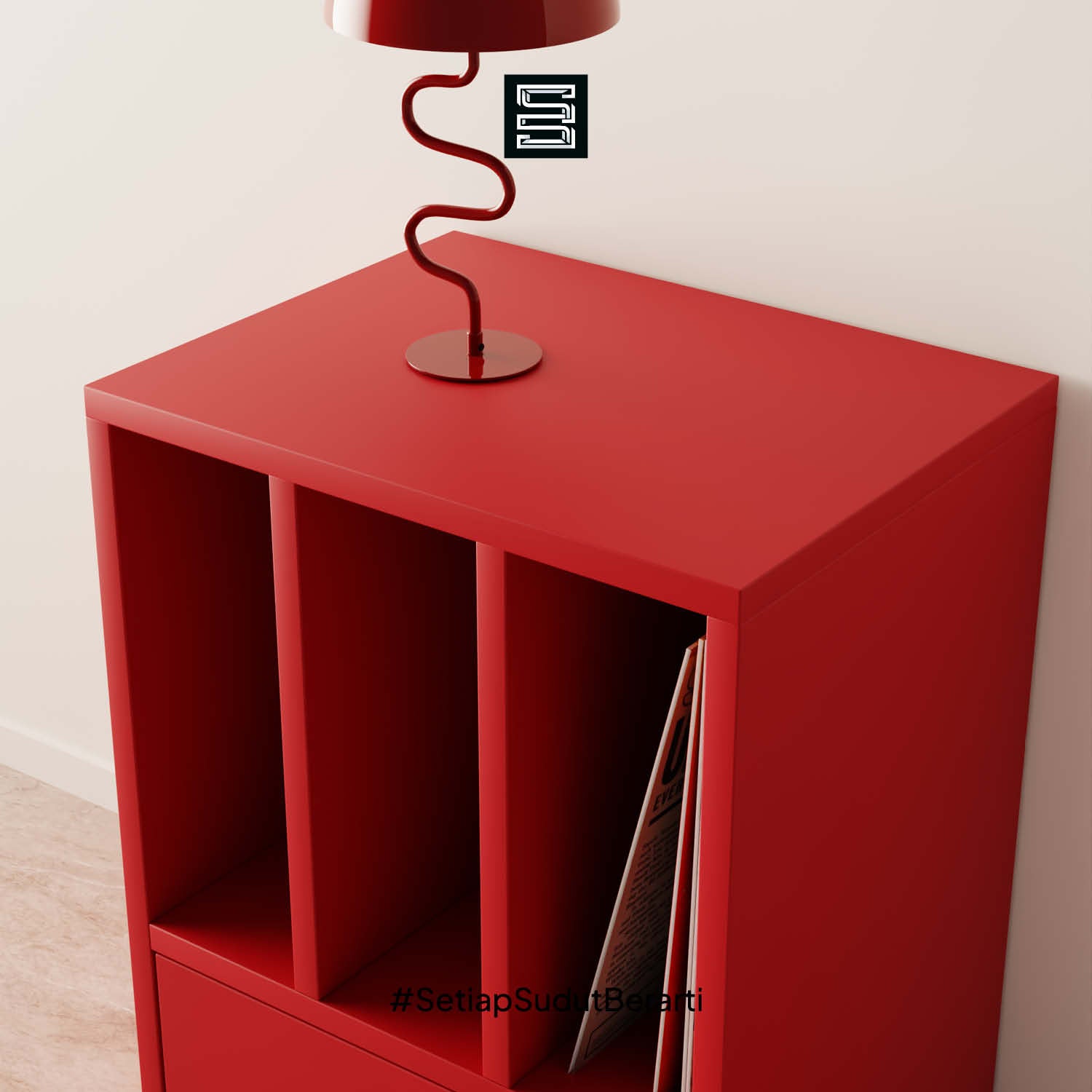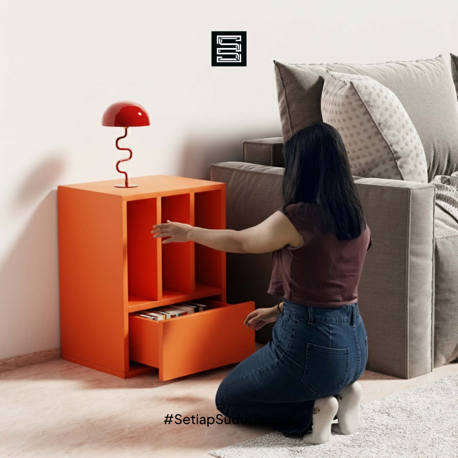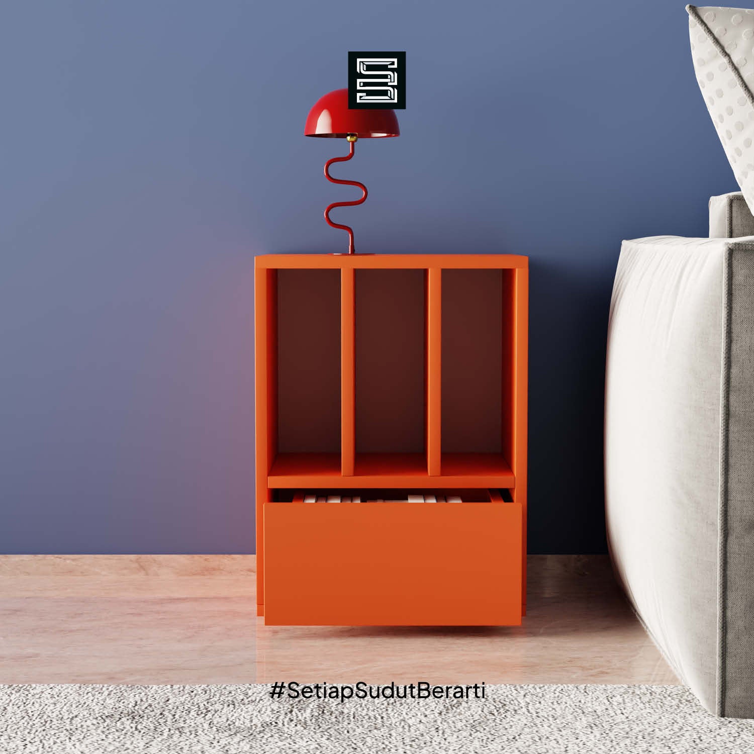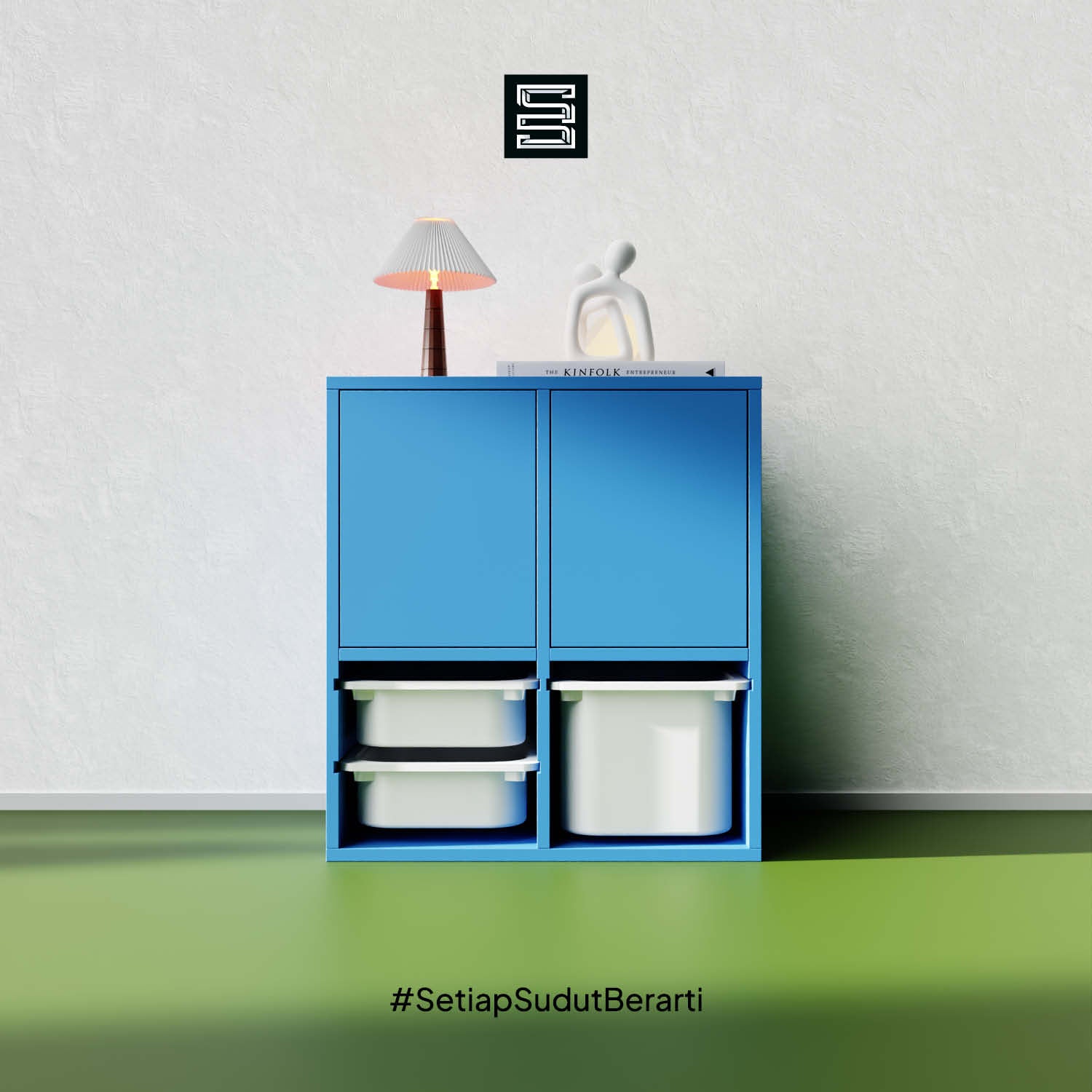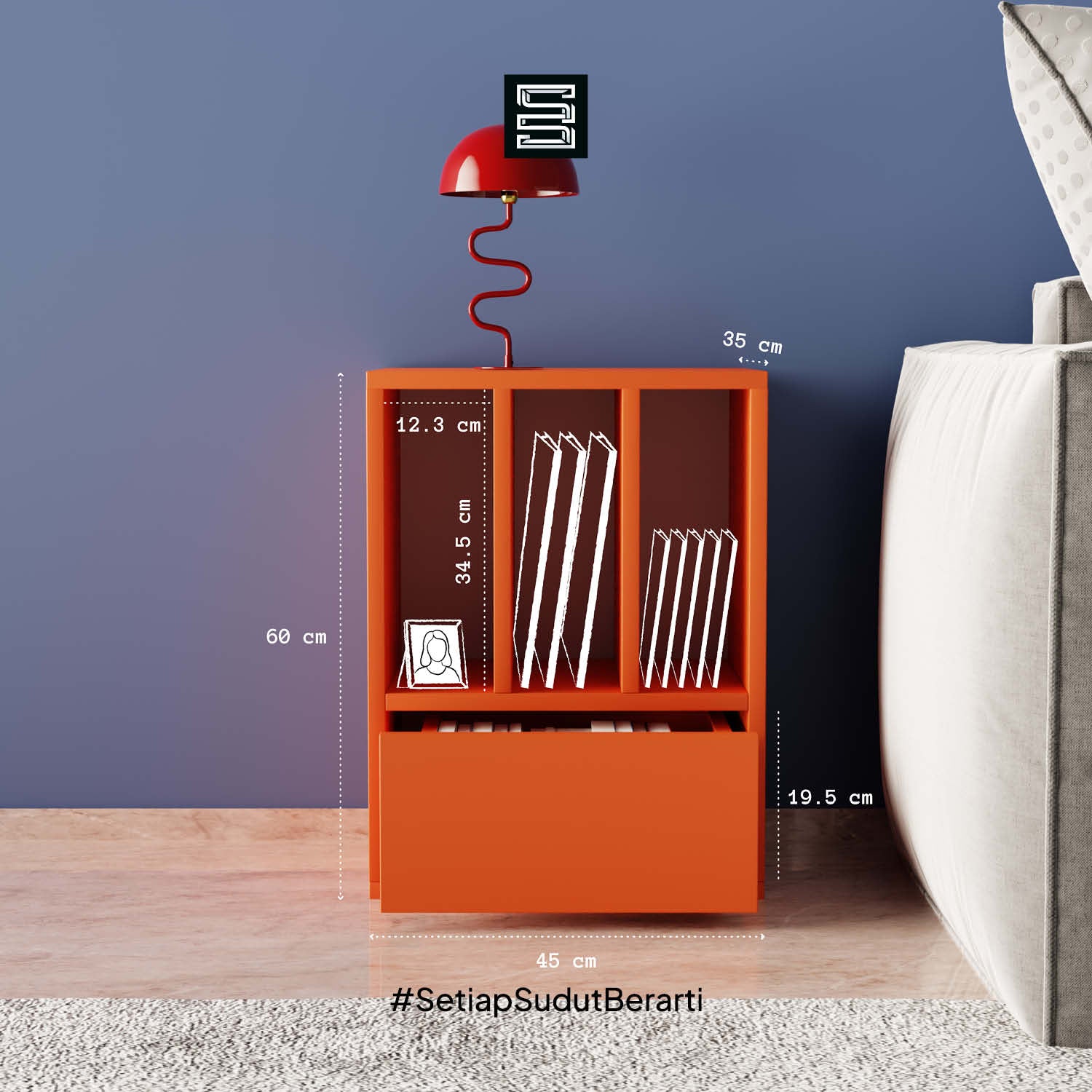Rak anak dengan kombinasi kotak penyimpanan putih dan laci. Didesain untuk memudahkan anak menyimpan mainan, buku, dan perlengkapan sekolah agar lebih rapi.